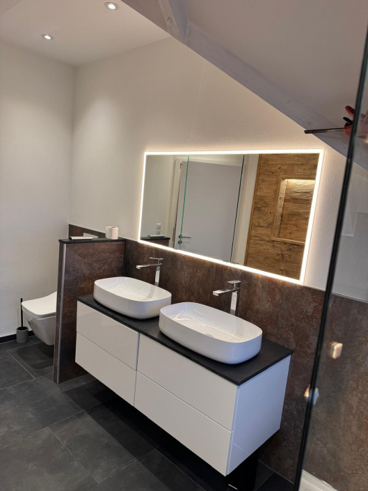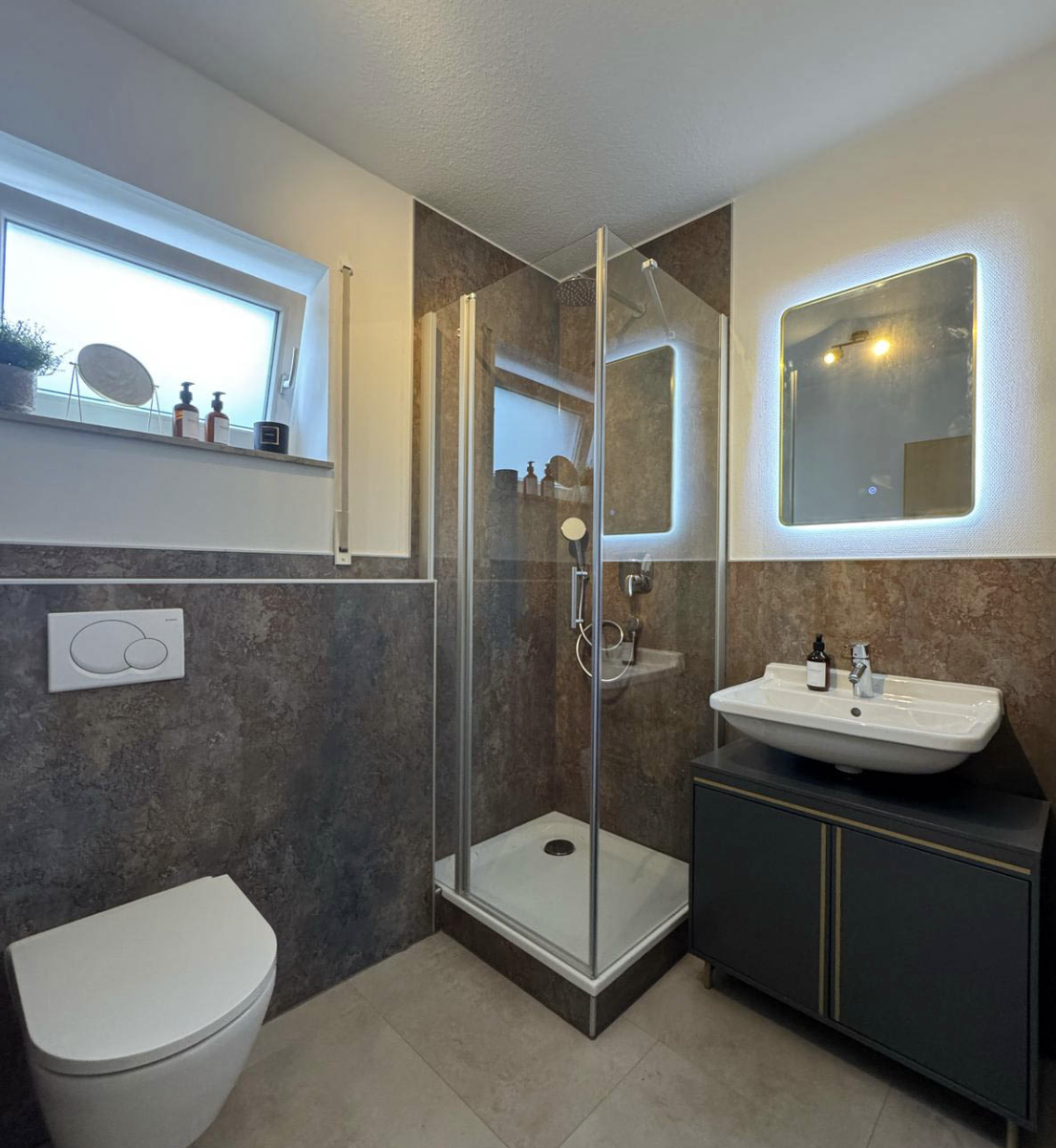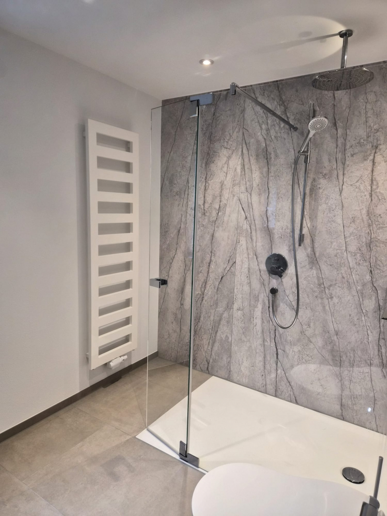 Wir realisieren fugenlose Bäder und wasserfeste Wandverkleidungen, die modernes Design, Funktionalität und Langlebigkeit vereinen. Die großformatigen, fugenlosen Oberflächen sorgen für eine ruhige, elegante Optik, sind besonders hygienisch, pflegeleicht und ideal für Bad, WC, Dusche, Küche oder Flur.